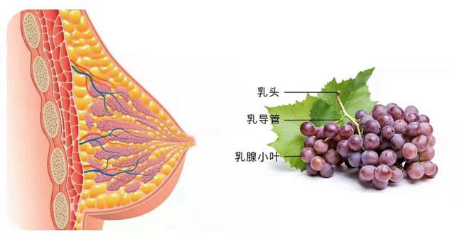 女性乳腺是由皮肤、纤维组织、乳腺腺体和脂肪组成的,如果要打个比方,我们的乳房就像是一串葡萄,乳腺导管就像连接一粒一粒葡萄的枝干,乳腺小叶就像是一组一组的葡萄,围绕乳腺小叶的脂肪组织就像葡萄周围的叶子。