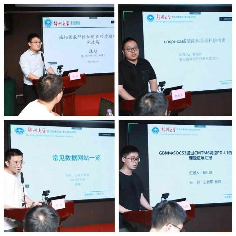 第四节由李军旗、梁武龙主持。2022届博士陈超分享了癌相关成纤维细胞在胶质瘤中的研究进展;2019级博士郭旭洋分享了crispr-cas9敲除体系质粒的构建;2020级博士胡楠分享了生物信息学分析常见数据网站一览;2020级硕士戴礼瑞带来了GBM中SOCS3通过CMTM6调控PD-L1课题进展汇报;李信晓博士分享了Microanatomy of central sulcus and its adjacent area in Human。