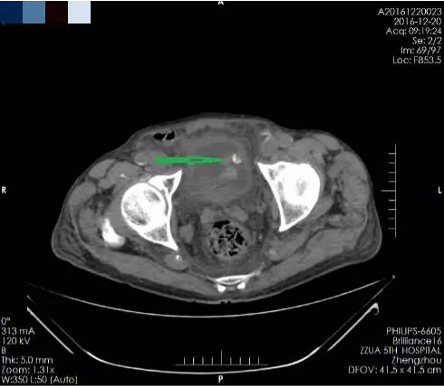 箭头所指为膀胱肿瘤