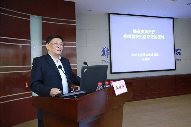 ▲ 郑州大学五附院特聘专家王振豫教授向大家汇报了《提高臭氧治疗椎间盘突出症疗效的探讨》。