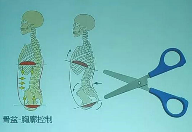 人的呼吸运动是储存于大脑的最基础的动作模式,婴幼儿是按照大脑的原始程序进行呼吸,每一次的呼吸都是把膈肌与盆底肌调整在共轴的位置上。但在孩子的成长过程中总会因为姿势、情绪、休息等很多原因,造成呼吸模式被潜移默化地发生改变,即膈肌和盆底肌的对位变成了开剪刀状态。这种不良的呼吸模式将不能建立起稳定的腹内压,从而使人体产生很多问题,如最常见的慢性下腰痛、胸椎灵活性减弱、髋关节灵活不足、肩关节疼痛等慢性肌肉骨骼疼痛。