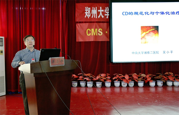 从左至右:消化内科一病区冯百岁教授、中南大学湘雅二院、国内著名IBD专家吴小平教授、我院院长郑鹏远教授、河南省人民医院李修岭教授、消化内科二病区夏兴洲教授。