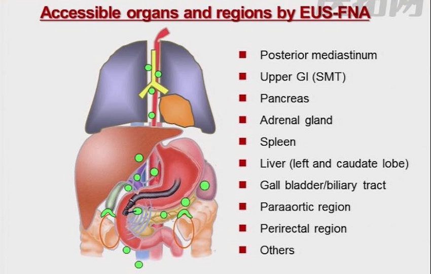 此外,EUS-FNA还在如下疾病诊断中具有重要意义,包括:胰腺周围大部分区域如胆总管下段和肾上腺、腹膜后淋巴结及占位、后纵膈淋巴结及占位、消化道粘膜下肿瘤或可疑消化道管壁增厚、局灶肝脏实性占位、直肠周围占位。通过EUS-FNA对以上疾病进行组织学细胞学诊断,对指导进一步药物及手术治疗具有重要临床意义,并可避免不必要的手术干预。
